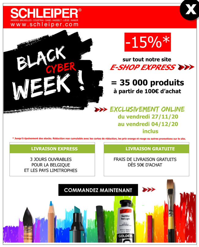 Commande en ligne de toutes vos fournitures artistiques, de papeterie et loisirs créatifs. Grâce à notre sélection de produits disponibles immédiatement en entrepôt, nous pouvons vous garantir une livraison rapide. Par souci écologique et afin de pouvoir offrir les frais de livraison, nous ne traitons pas ici de commandes d’un montant inférieur à 95€