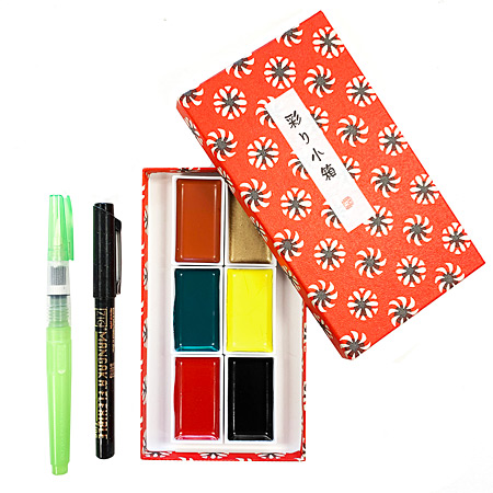 Kuretake Irodori Kobako - watercolour set - 6 Gansaï tambi pans, 1 waterbrush H2O & 1 Mangaka brush pen
