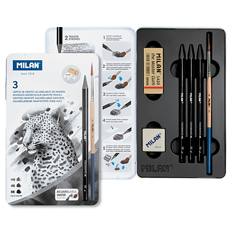 Milan Etui en métal - assortiment de 3 crayons graphite aquarellables sans bois & accessoires