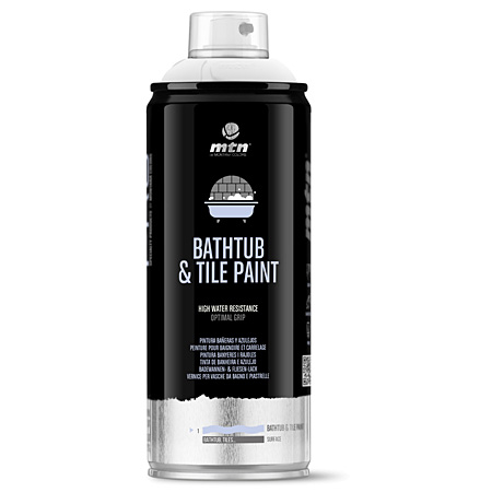 The MTN PRO Bathtub and Tile Paint is a white satin spray paint developed with modified epoxy resins.