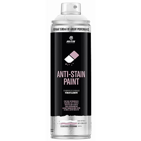 MTN PRO Anti-Stain spray paint is a white paint formulated with high quality acrylic resins, together with titanium dioxide and special additives.