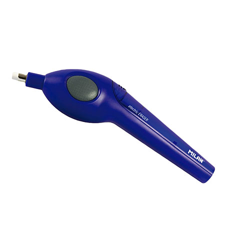 Contains: one electric eraser, 7 white plastic erasers, 4 blue abrasive erasers and 2 x 1.5V AAA batteries. Instructions for use: push the button and press the eraser down lightly on the area to be erased (excess pressure will halt the rotation of the eraser). |