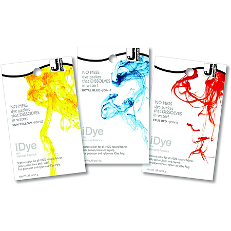 iDye comes in a dissolvable packet, so there are never any messy powders to handle: simply dissolve the packet in the dye bath or drop it in the washer, then add the fabric. A hot water dye that produces brilliant colors on any natural fabric, iDye may be used on the stovetop or in the washing machine on the hottest cycle. Great for over-dyeing techniques and reviving faded garments! FABRIC/FIBER/SURFACES: cotton, linen, canvas, silk, rayon and more |