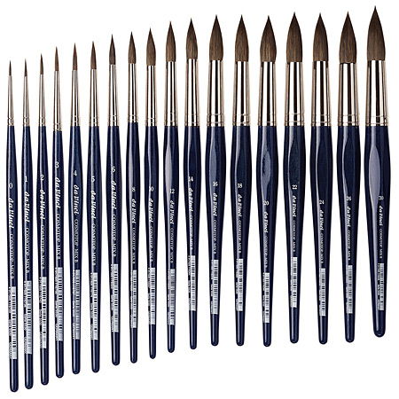 Short blue transparent lacquered esagonal handles So-called silver ferrule Techniques: for watercolour painting and aqueous colour Inexpensive alternative to Red Sable brushes |