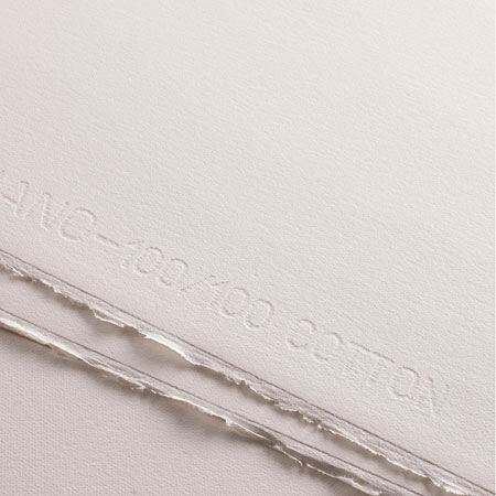 Gemakt uit hoogwaardige rustoffen van 100% katoen, op een rondzeefmachine. Dit verouderingsbestendig papier heeft een "Lonf Life" certificaat. Ideaal geschikt voor letterpress, etstechnieken, litographie, linoleum- en houtsnede, en zeefdruk. Het watermerk loopt parallel aan de lange zijden van het vel papier en reproduceert de melding "C.M. Fabriano 100% Cotton". Gescheurde schepranden aan de lange zijden (voor het formaat 70x100cm). Gebroken wit. |