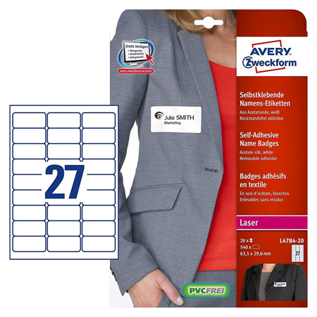 Avery Zweckform Paquet de 20 feuilles de 27 étiquettes adhésives pour badges - en acétate - 63,5x29,6mm - blanc