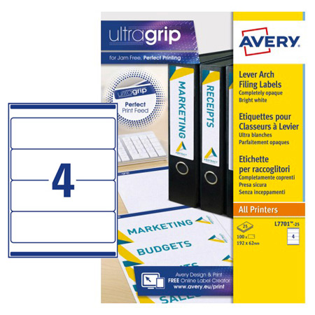 Avery Pakje van 25 vellen van 4 zelfklevende rugetiketten - 192x62mm - wit