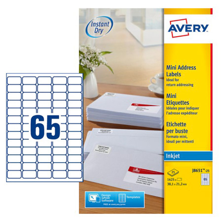 Avery Étiquettes jet d'encre - 38,1x21,2mm - 65/page - 25 feuilles A4 - coins arrondis - blanc