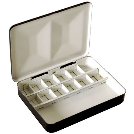Boîte d'aquarelle vide en métal laqué avec petites cases pouvant contenir 1ml de couleur.