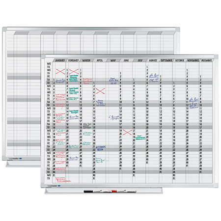 - Fill out months and days and visualise an entire year - Entire year at a glance - Anodised aluminium frame - Light-weight honeycomb board structure - Practical design - Magnetic date strips to update each year - Magnetic; suitable for writing on with dry wipe board markers (only Edding of Legamaster markers) - Enamel surface (double fired at 800°C) - Acid and scratch resistant - Write on / dry wipe surface is guaranteed for 25 years when used in combination with Legamaster accessories - Comes complete with fixing kit, marker tray, date strips and one board marker - Grid size: H 22 x W 70 mm |