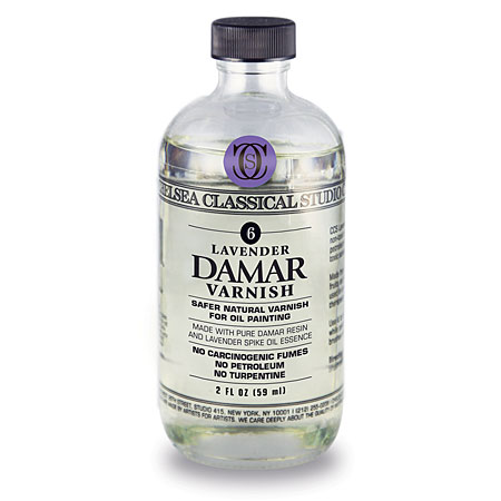 Chelsea Classical Studio Lavendel Damarvernis en Chelsea Classical Studio Lavendel Retoucheervernis bestaan beide uit Damar, een natuurlijke hars, opgelost in onze lavendel-spijkolie. Dit is een oplosmiddel op natuurlijke basis, dat sinds de Renaissance wordt gebruikt. Het verdampt even snel als terpentijn, terpentine (gewone, geurarme of geurloze) en petroleumdestillaten, maar is veiliger in gebruik. Het is niet carcinogeen en veroorzaakt geen acute of chronische gezondheidsproblemen.