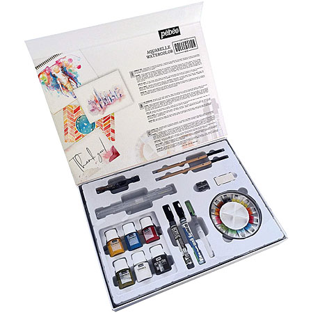 Pébéo Aquarelverf - collection doos - 12 halve napjes, 6 inkt flacons & toebehoren