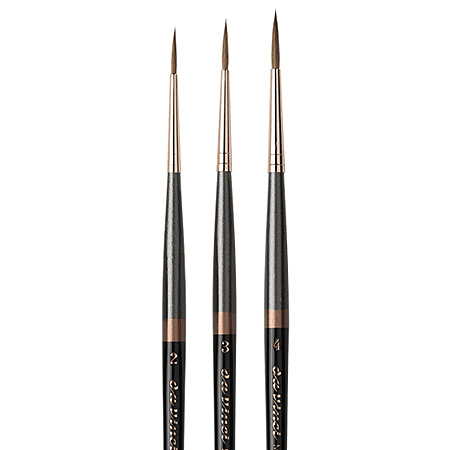en poil de martre rouge Kolinsky sélectionné haute élasticité avec une pointe d‘aiguille extrêmement fine équipées de viroles sans soudure de couleur cuivre et de manches hexagonaux tricolores. L‘outil parfait pour le professionnel de la miniature Chaque pinceau est formé à la main par des maîtres pinceaux spécialement qualifiés à Nuremberg et testé pièce par pièce |