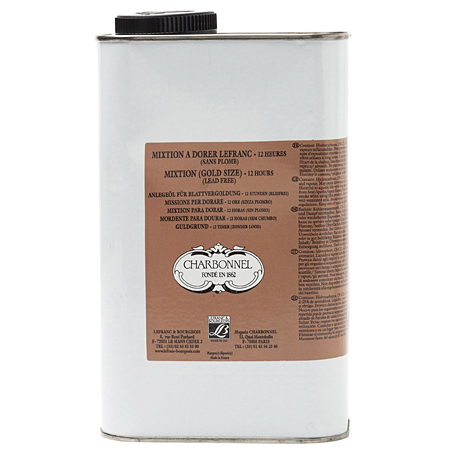 La mixtion à dorer à l’huile est un mélange spécial qui permet de coller la feuille d’or sur des surfaces non poreuses (verre, métal, marbre, etc.)