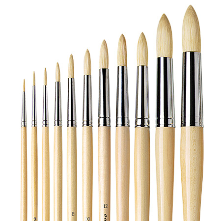 Long natural polished handle So-called silver ferrule Techniques: acrylic, oil, tempera Maestro white bristle brushes are built with the natural curve of bristles tunred inwards. Two equallysized tufts of bristle are set against each other without tension and made to interlock. Properly cleaned after each use the brush will retain this shape even after long use and many washings. |