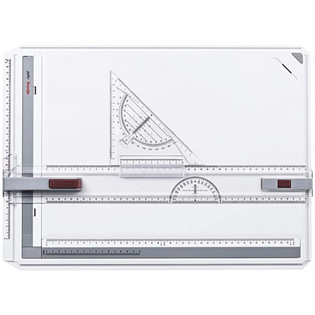 - Robust board of unbreakable, non-warping material. - Ergonomic design for easy, comfortable working. - Parallel straightedge with STOP-and-GO locking/unlocking action. - The L-system straightedge design - allows drawing along the top edge of the straightedge right down to the bottom of the sheet, with full accuracy and stability. - Two magnetic clamp strips with central pushbutton operation plus additional corner clamp, for exact media positioning and absolutely secure holding. - Guide rails designed for permanently smooth, featherlight straightedge movement. - End lock on A3 straightedge for added stability. - Comes complete with rapid set square for drawing vertical and horizontal lines and angles. - Includes tilters for comfortable working. |