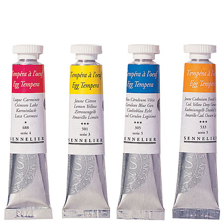 La Tempéra formulée par Gustave Sennelier en 1895 est une émulsion de produits naturels. Elle prend pour base les recettes des maîtres du 16ème siècle et elle se compose de jaune d'oeuf, d'huile végétale pure non jaunissante, de gomme arabique, de baumes naturels pour le liant et de pigments sélectionnés (pigments minéraux principalement). Ces couleurs sont broyées "à l'ancienne" avec des meules en pierre, dans le respect de la tradition. Cette recette ancienne confère aux tons une fraîcheur exceptionnelle, une grande luminosité et une bonne stabilité à la lumière. La mise en oeuvre est simple. Les couleurs Tempéra se diluent à l'eau, sèchent rapidement en donnant un film mat-satiné. Elles s'appliquent généralement en couches fines superposables mais on peut peindre en texture en gardant le modelé de la touche. La consistance onctueuse de la Tempéra donne une touche fluide. Si la Tempéra appliquée légèrement facilite les superpositions, son pouvoir couvrant est remarquable. La couleur Tempéra s'applique sur toile, bois, carton...et sur tous supports correctment enduits d'une préparation maigre. Après un séchage de quelques mois, l'oeuvre peut être vernie soit avec du vernis gouache pour la conserver dans son état initial soit avec un vernis pour peinture à l'huile si l'on désire donner à la Tempéra l'aspect de l'huile. |